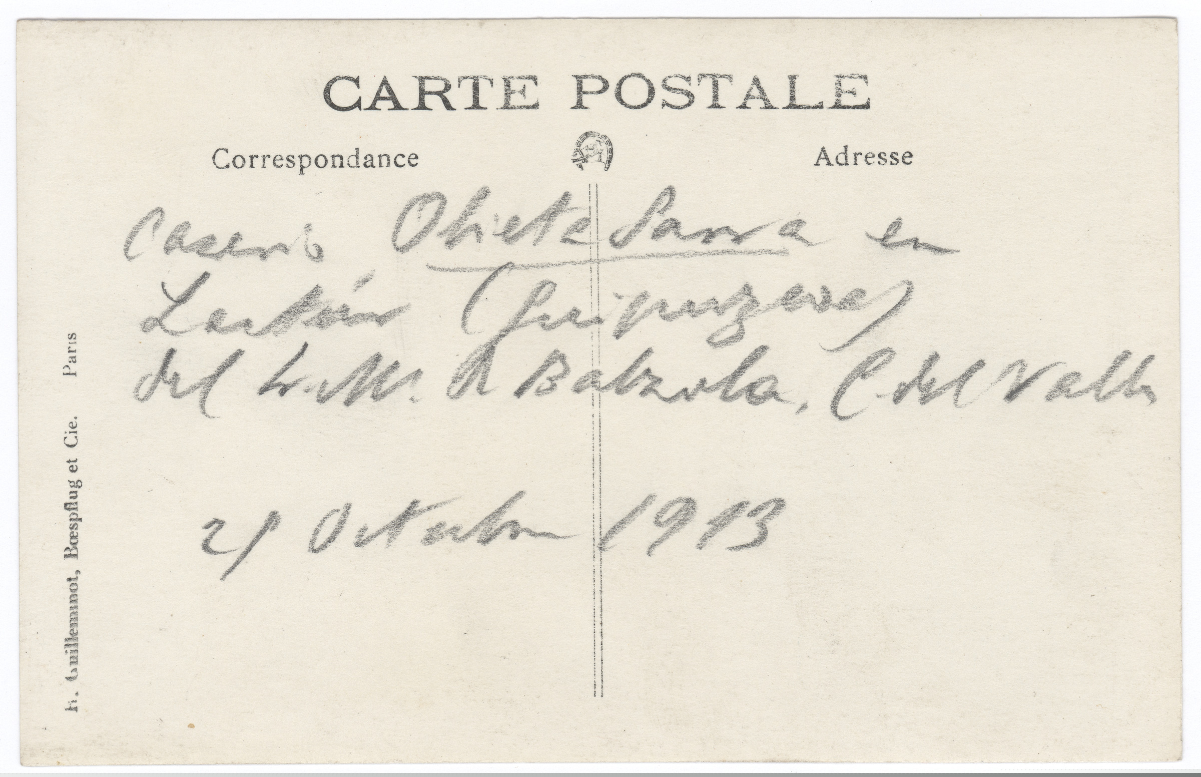 | Talde bat, Lasturreko Obieta Zar baserriaren aurrean | Caserio Obieta sarra en Lastúr (Guipuzcoa) del Sr M. de Balzola, Conde del Valle. 25 Octubre 1913. [m.s.v.] carte postale, corespondance, Adresse. R. Guilleminot, Boespflupg et Cie. Paris. [imp.v.] |