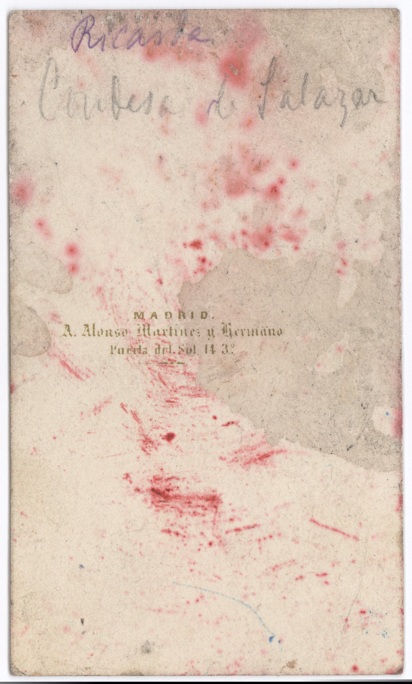 Emakume erretratua | Ricarda. Condesa de Salazar. [m.s.v]. A. Alonso Martinez y hermano. [imp.r]. Madrid A. Alonso Martinez y hermano Puerta del Sol 14 3º. [imp.v.]. |