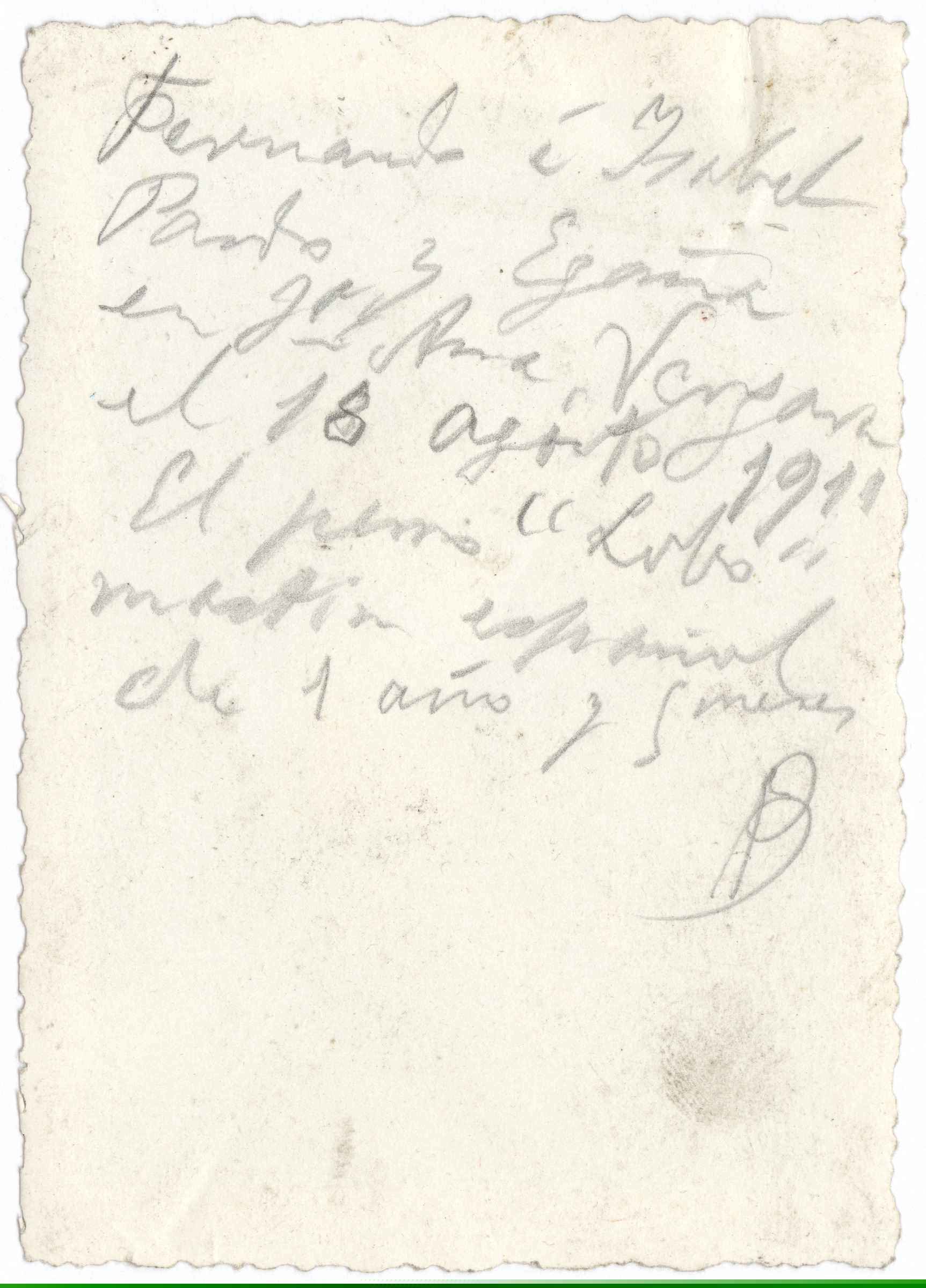 | Neska-mutikoa txakurrarekin | Fernando e Ysabel Pardo y Egaña. En Santa Ana, Vergara el 18 de Agosto 1911. El perro " Lobo" mastin español de 1 año y 5 meses. [m.s.v.] |