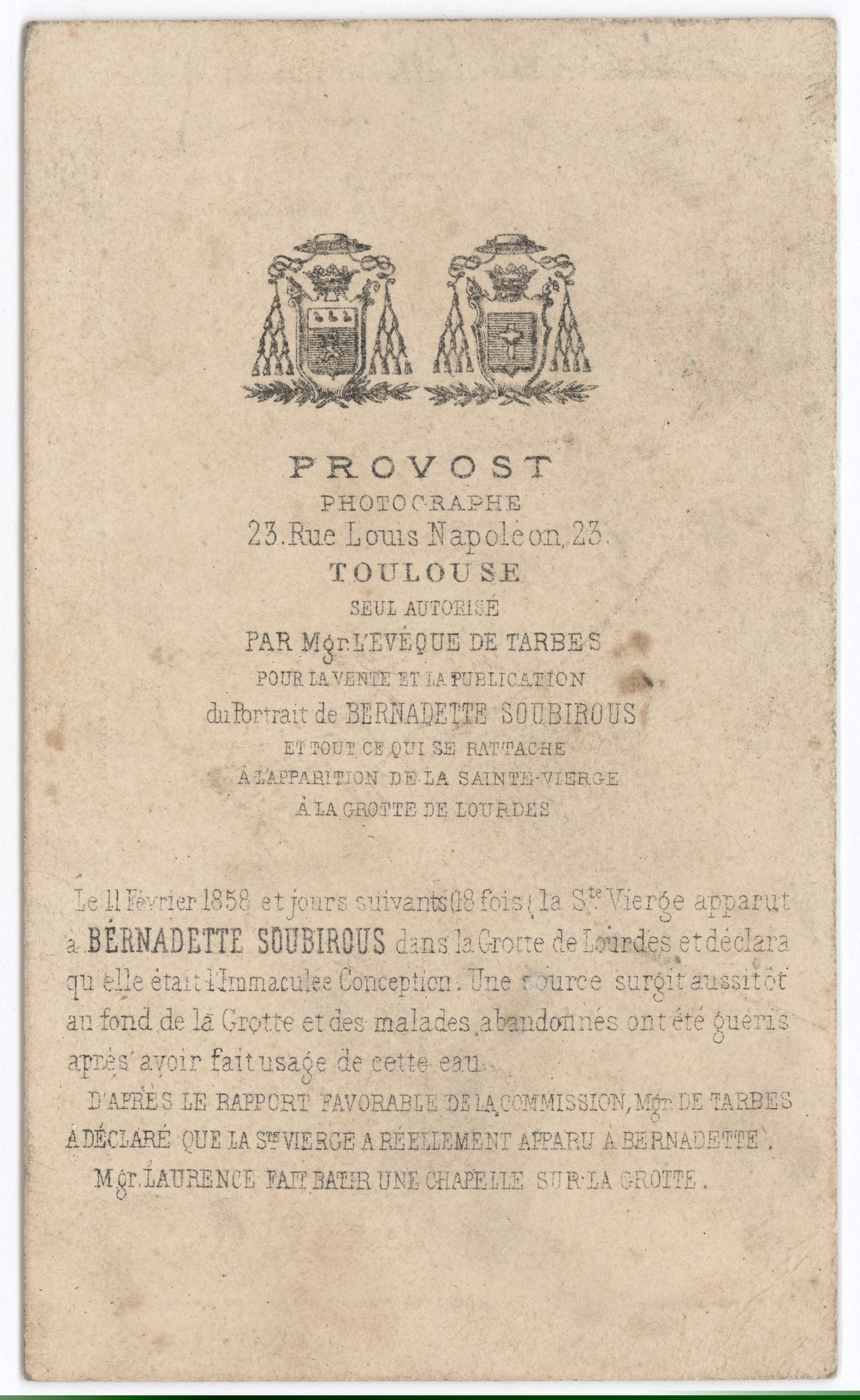 | Lourdeseko Ama Birjina | Provost photographe 23 rue Louis Napoleon, 23 Toulouse seul autorisé par Mgr. L´evéque de Tarbs pour la vente et la publication du portrait de Bernadette soubiroubirous et tout ce qui se rattache Ä l´apprition de la Sainte - Vierge Ä la grotte de Lourdes. [imp.v.]. Grotte de Iourdes. [imp.r.] |