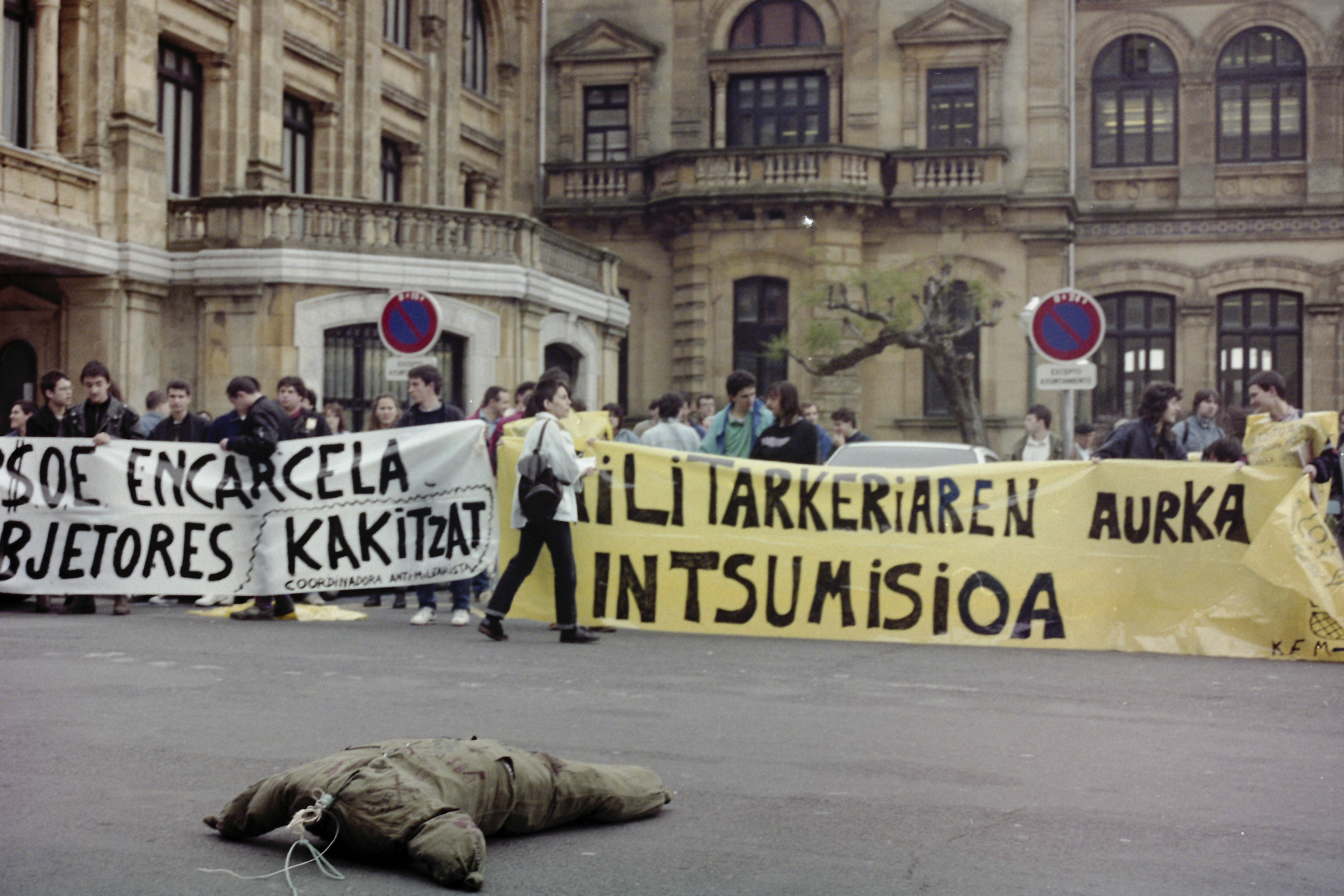 | Donostiako Gobernu Militarraren egoitzaren aurrean egindako manifestaldia. Pankartetan: "Militarkeriaren aurka. Intsumisioa"; "PSOE encarcela a los objetores. KAKITZAT" |