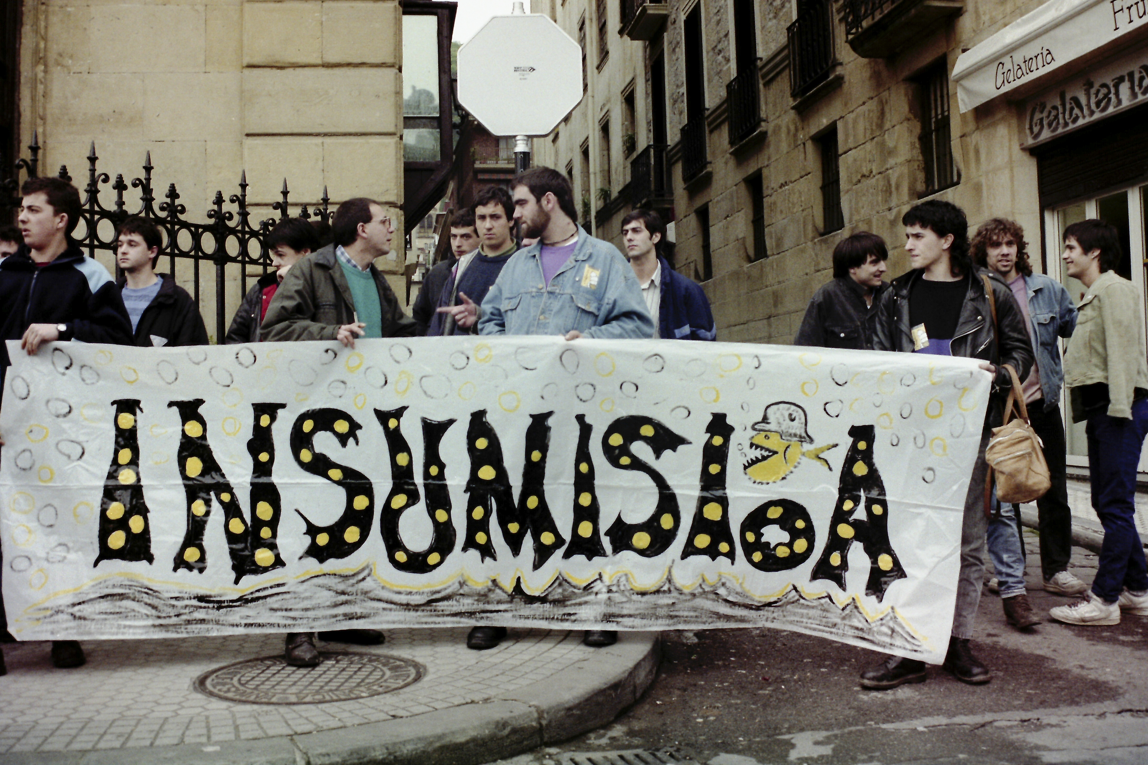 | Donostiako Gobernu Militarraren egoitzaren aurrean egindako manifestaldia. Pankartan "Insumisoa" leloa |
