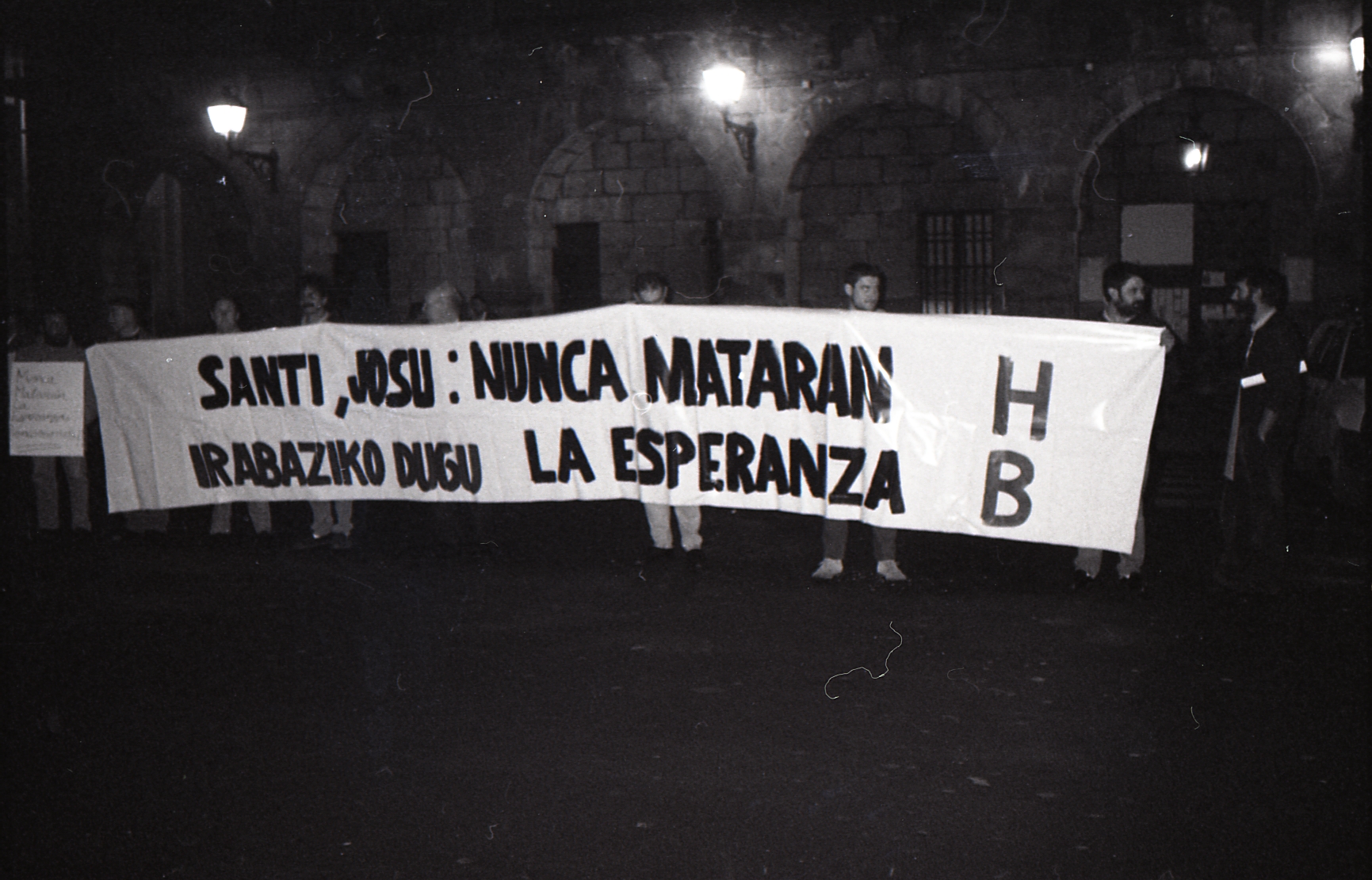 | Santiago Brouard eta Josu Muguruzaren heriotzen urteurrenean egindako manifestazioa. Pankartak dio: "Santi, Josu. Irabaziko dugu. Nunca matarán la esperanza. HB " |