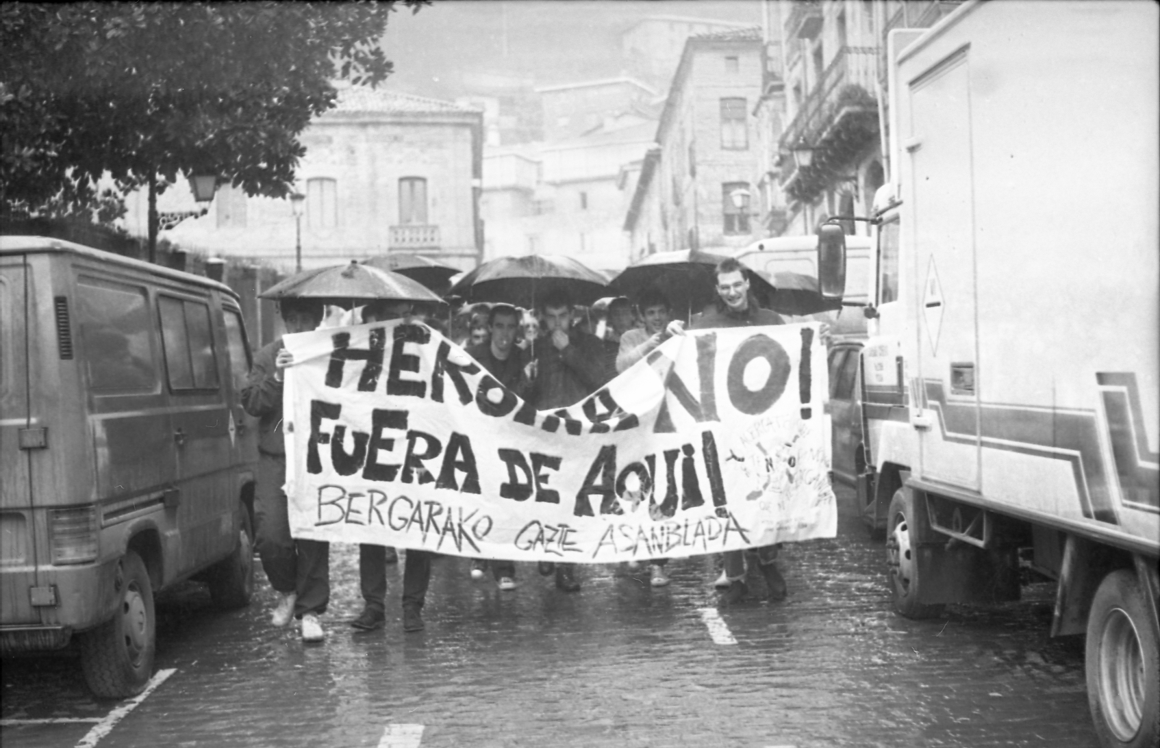 | Heroinaren aurkako manifestaldia "Heroina no!. Fuera de aquí. Bergarako Gazte Asanblada" lelopean |