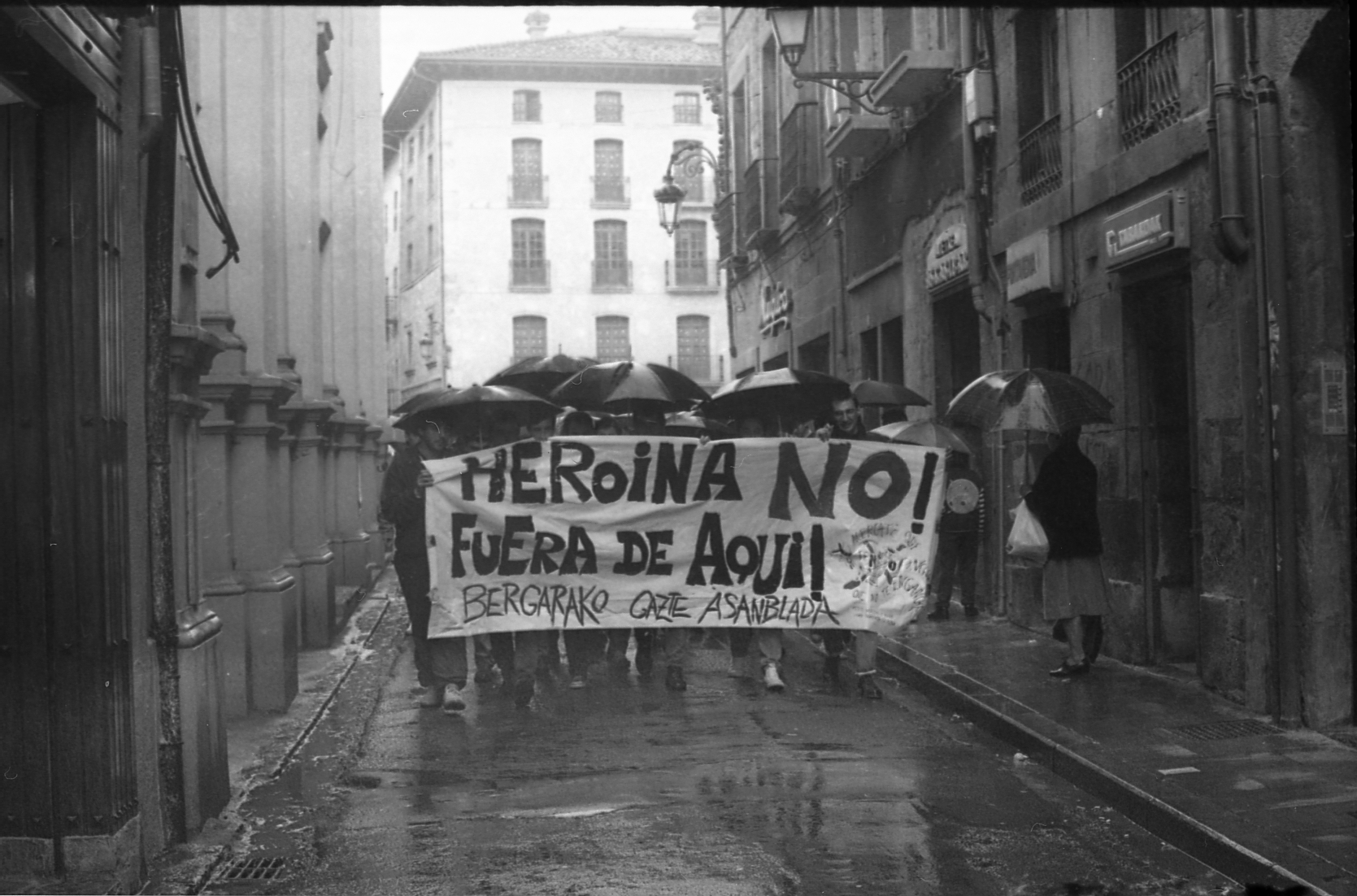 Heroinaren aurkako manifestaldia "Heroina no!. Fuera de aquí. Bergarako Gazte Asanblada" lelopean |