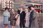 Lehen planoan hiru gizon San Migelen eta atzekaldean bergarako bista orokorra