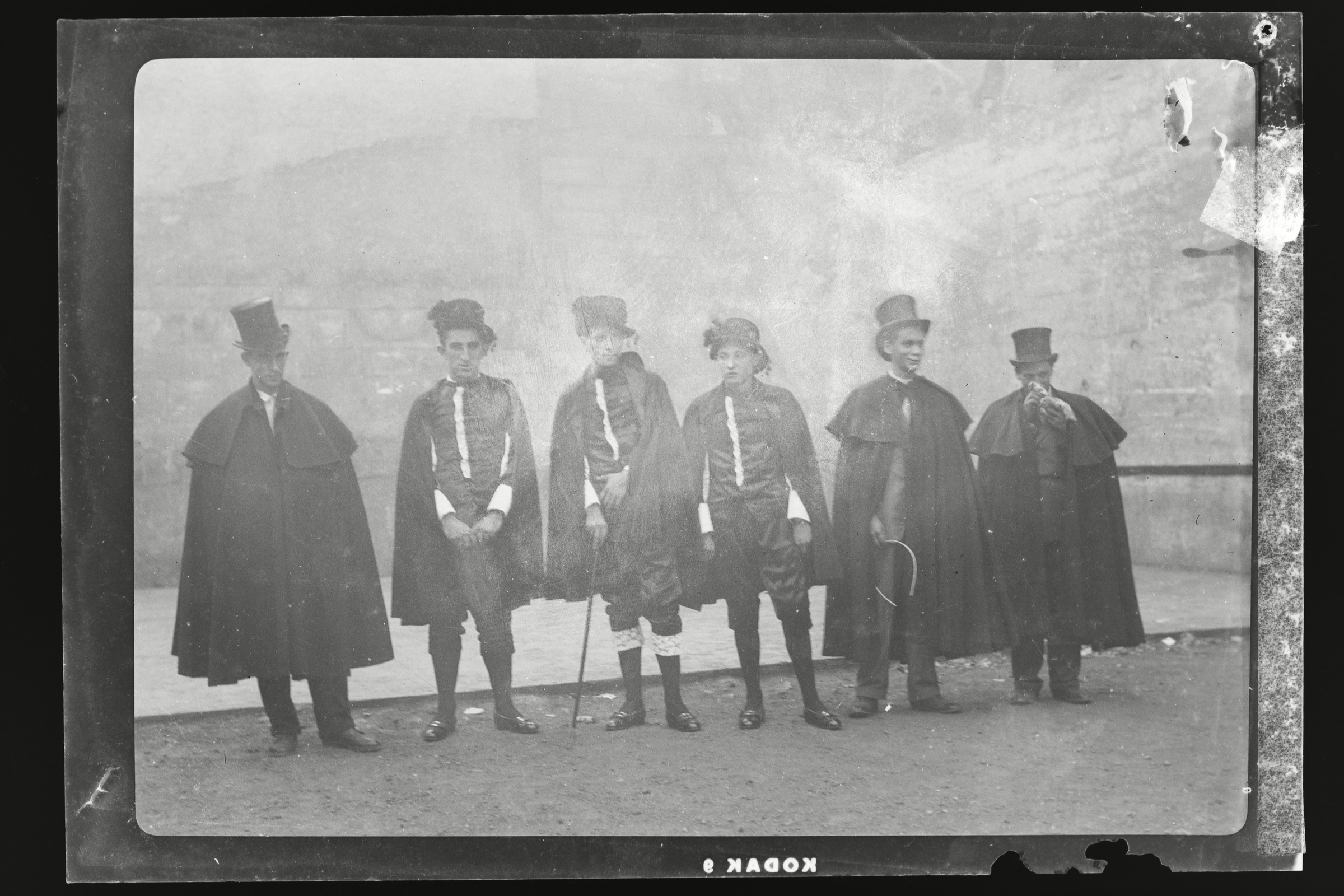 Gizon taldea frontoian. Eskumako bigarrenak alkatearen makila darama.