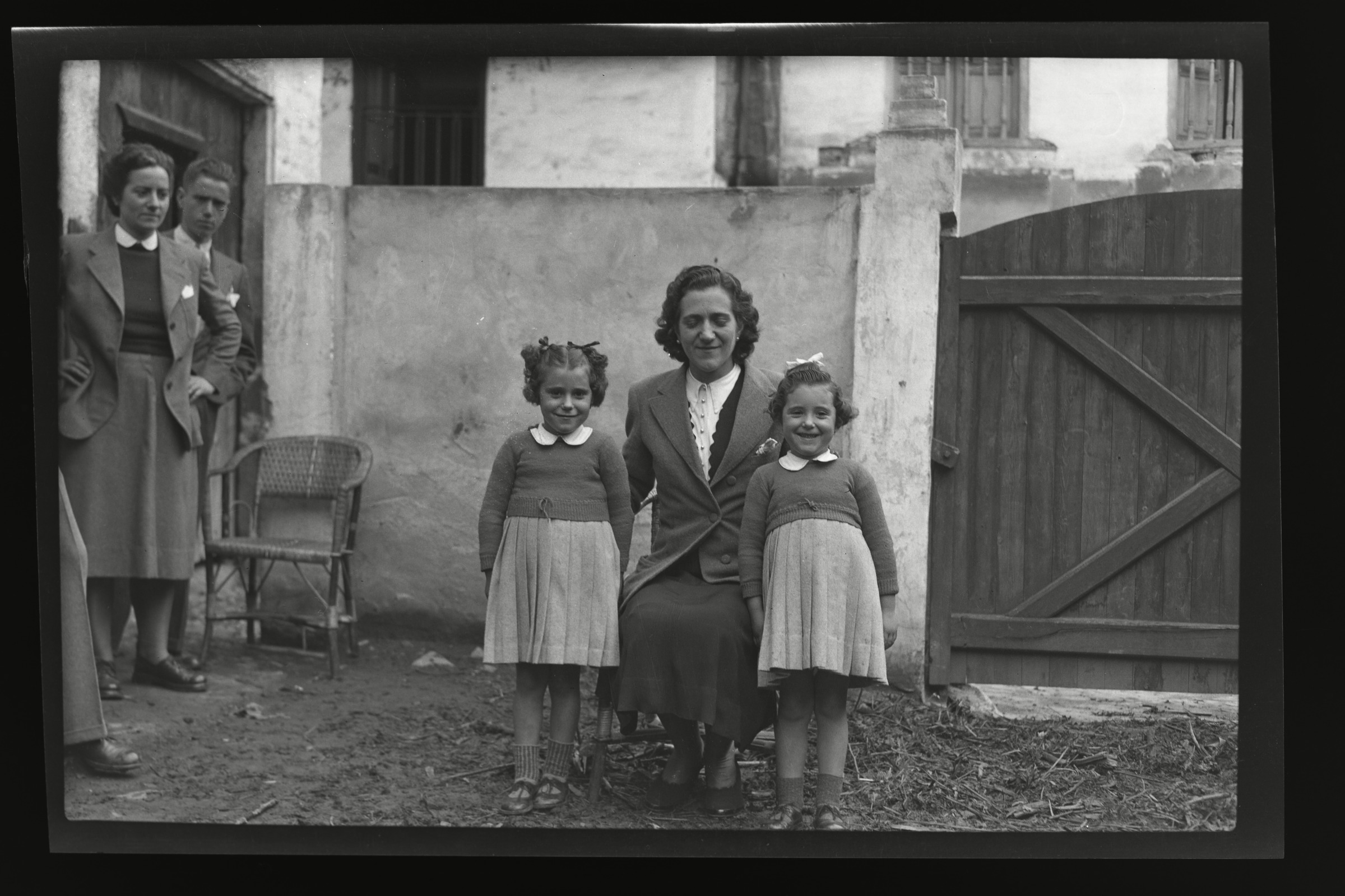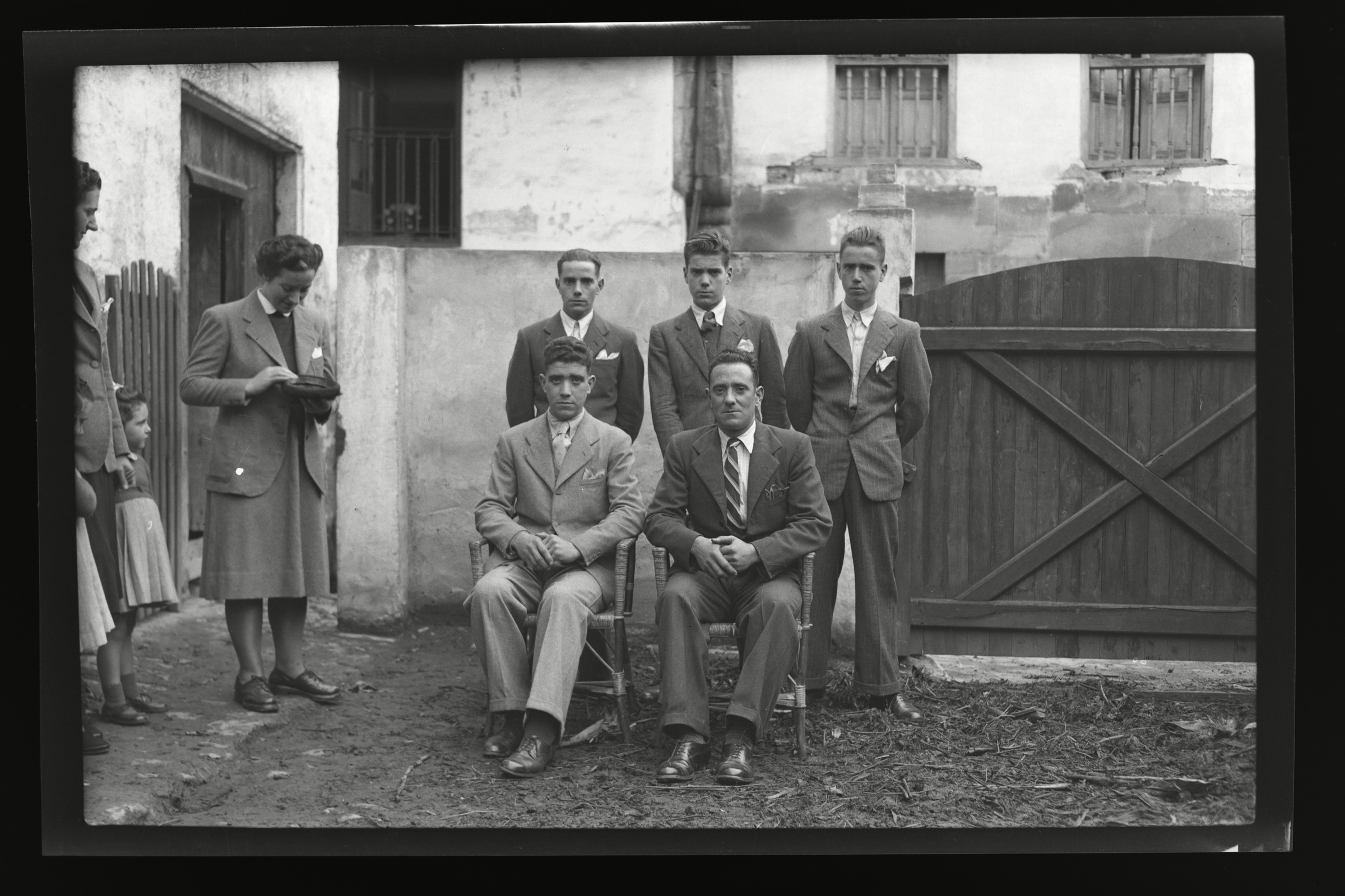 Bikote bat aulki banatan eserita. Ondoan emakume bat traje bat jantzita zutik.
