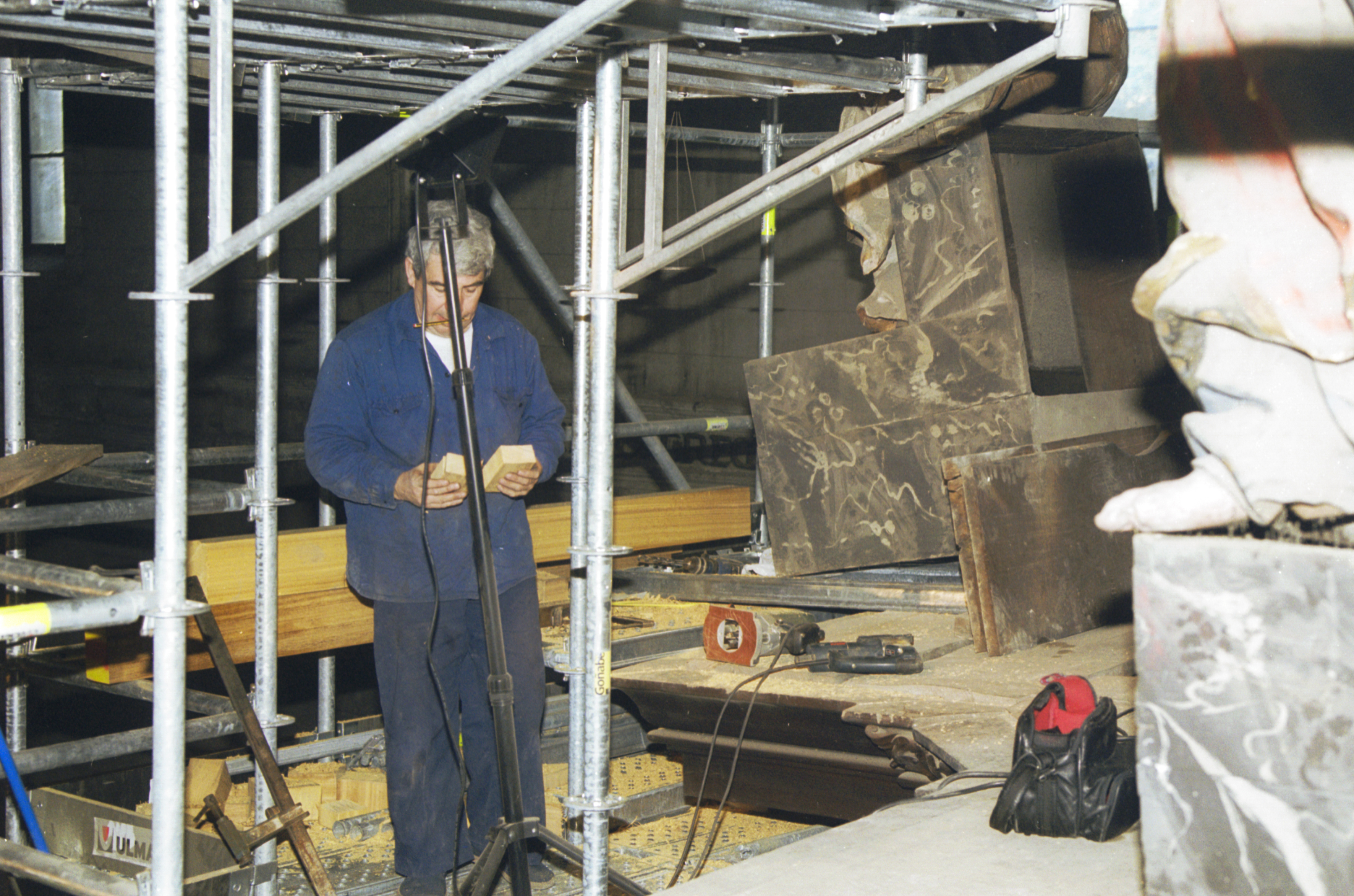 Santa Marinako erretaula nagusia gogortzeko lanak: langilea lanean