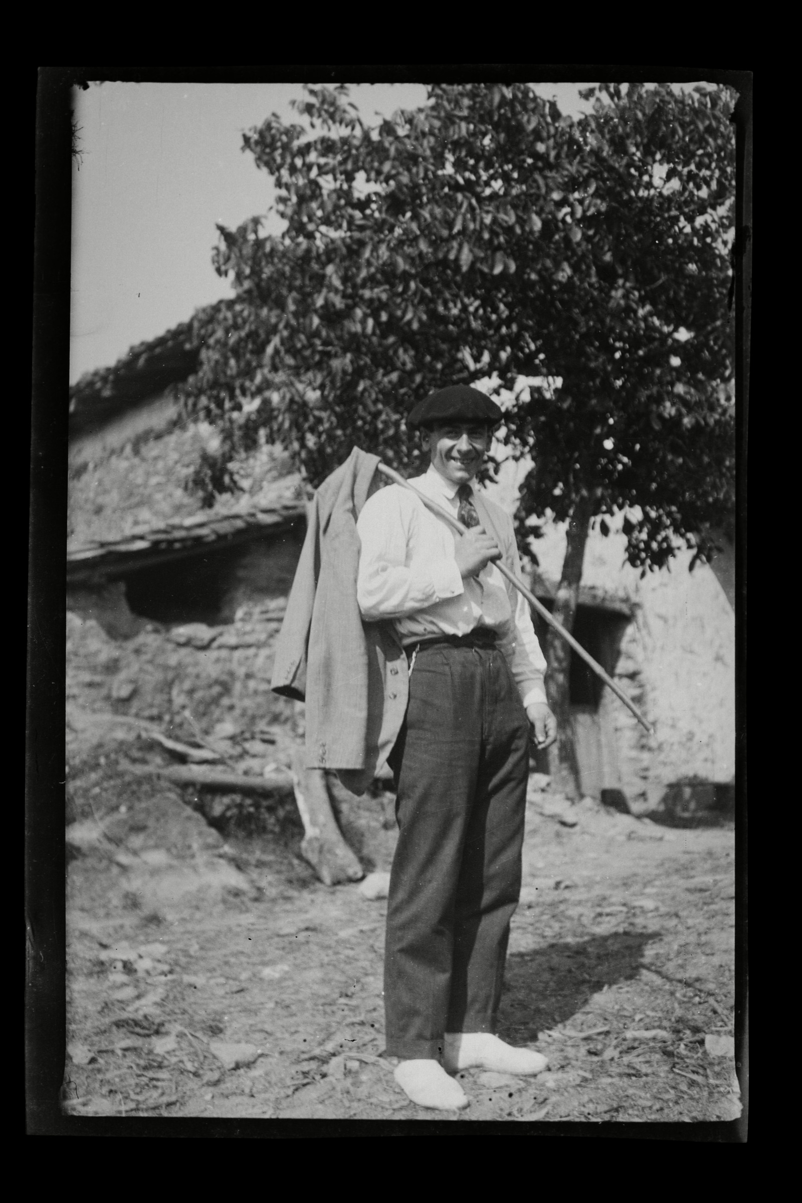 Gizon erretratua. Atzean baserri bat ikus daiteke eta txaketa makilarekin darama sorbalda gainean
