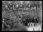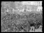 Jendetza Madrilgo Cibeles plazan: argazkia Banco de Españatik aterata dago, parean ikusten den eraikuntza Linares jauregia da (Casa de America)