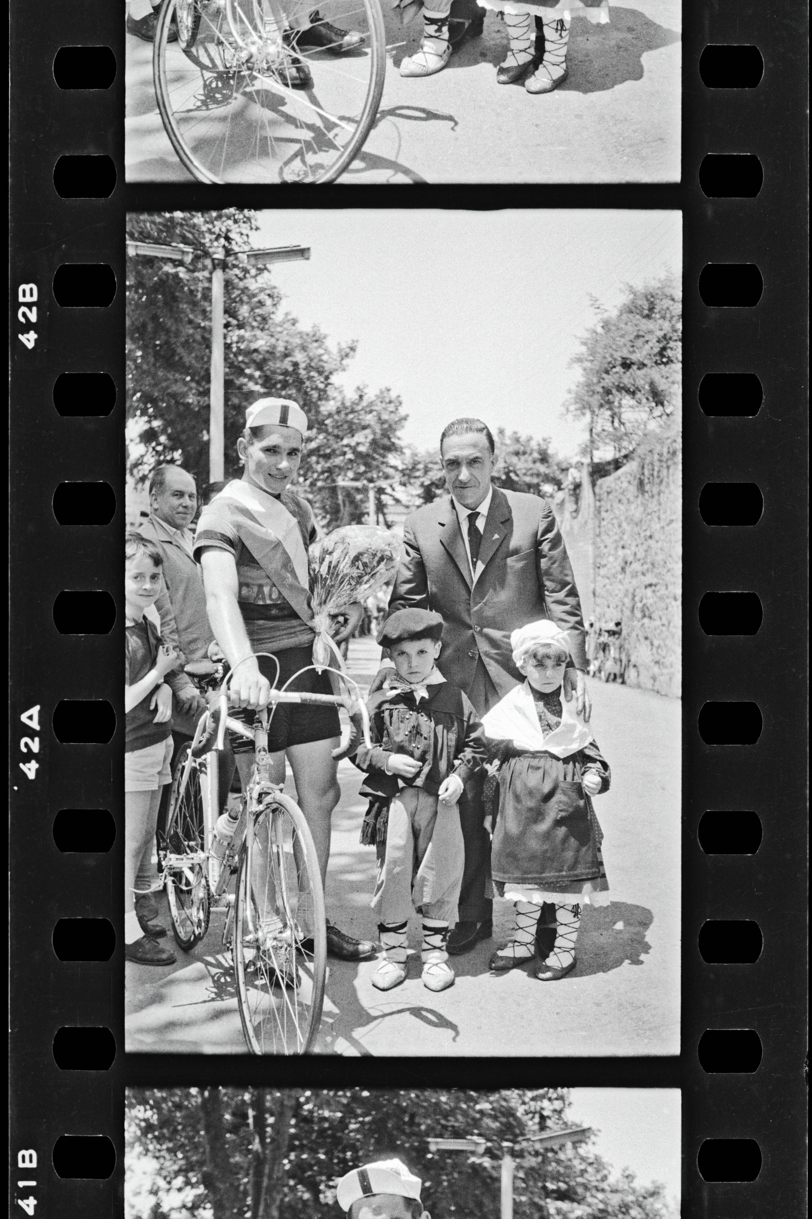 Talde erretratua: Txirrindularia irabazlearen banda eta loresortarekin, kalez jantzitako gizona bere alboan eta neskamutikoak baserritar jantzita aurrean