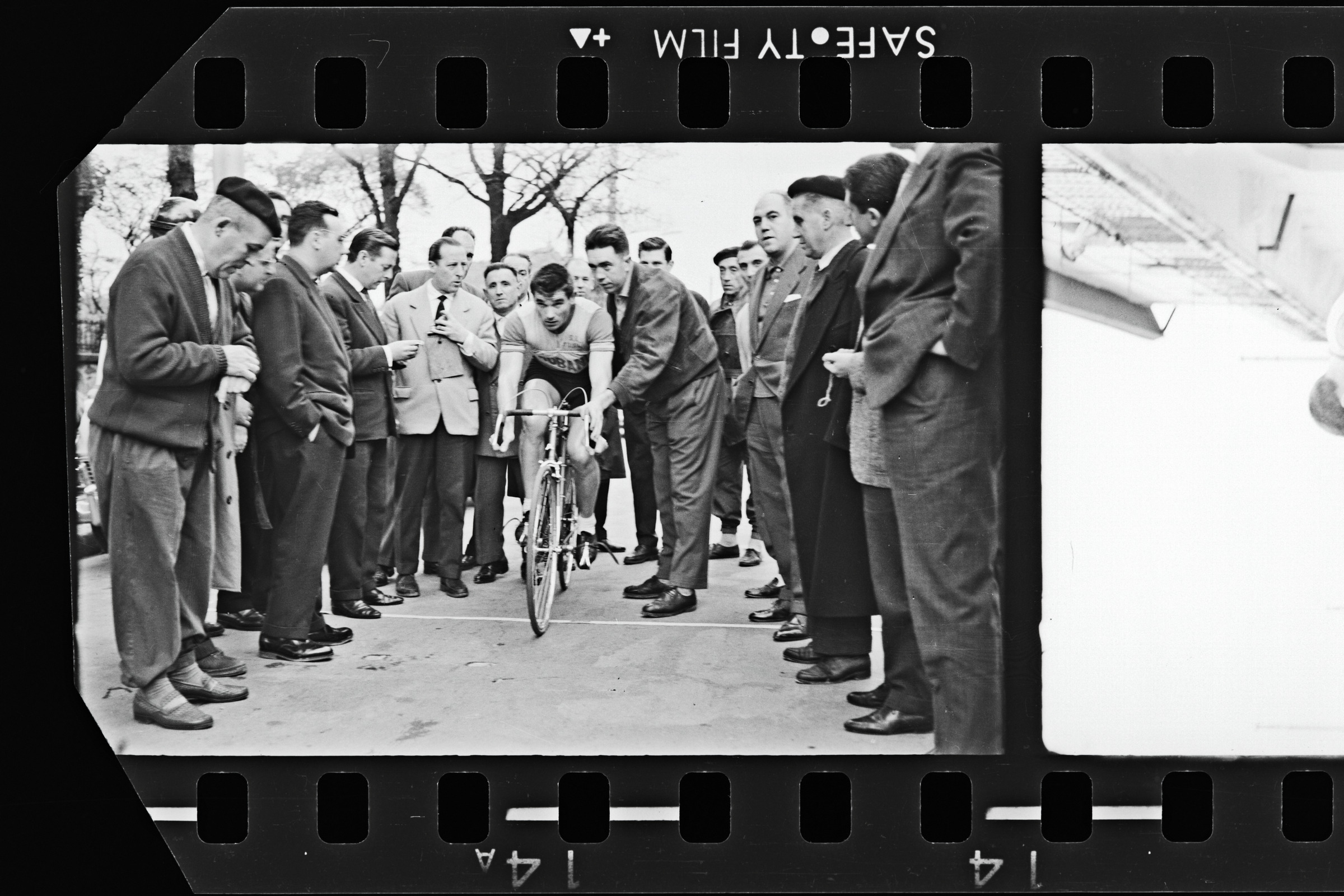 Txirrindularia, txirrinduaren gainean, lasterketa hasteko prest, jendez inguratuta