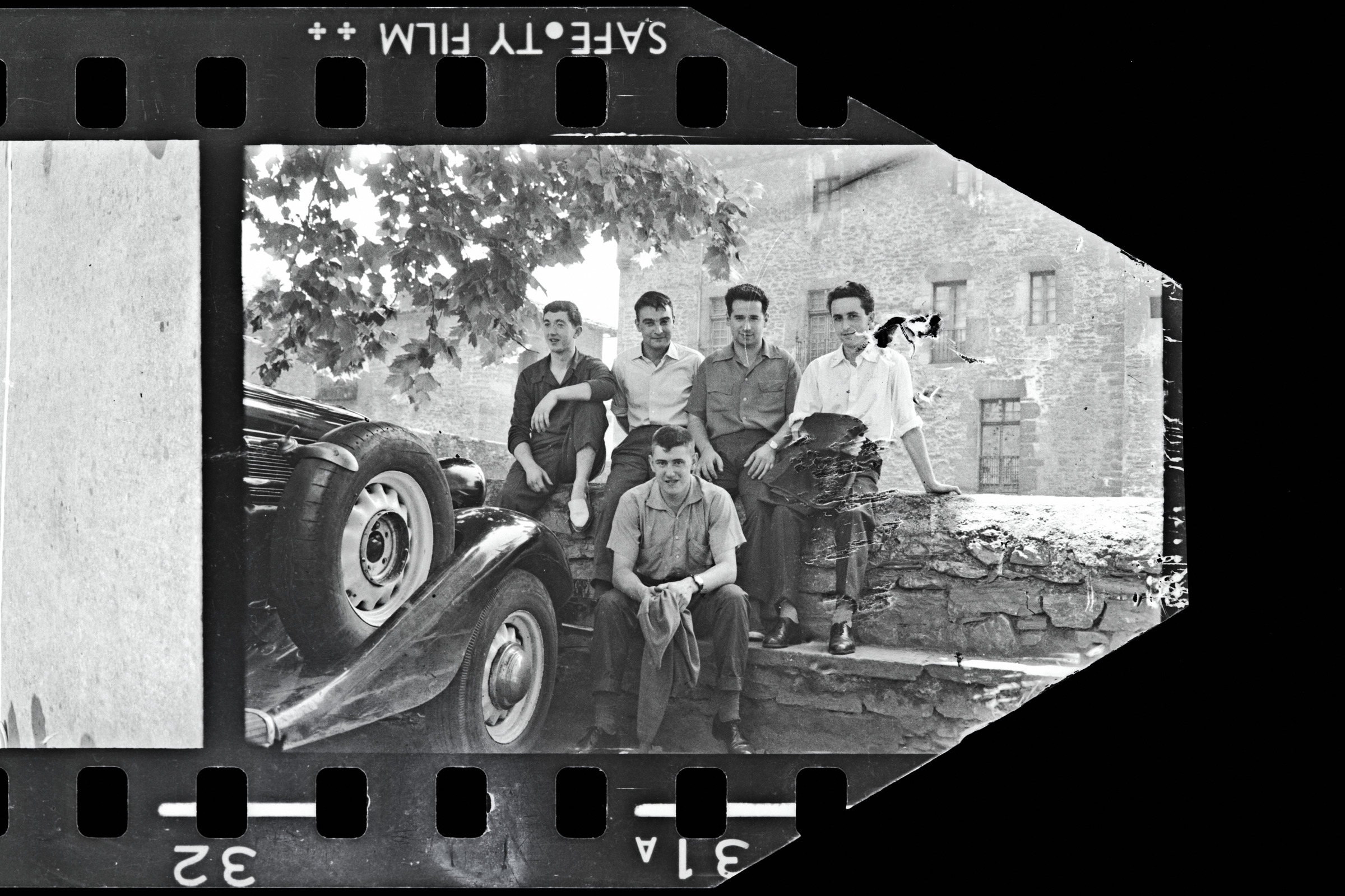 Bost gizonen erretratua Zubietako pretilean. Ezkerrean kotxearen muturra; barrenean Laureaga torrearen erreka aldeko fatxadaren zatia