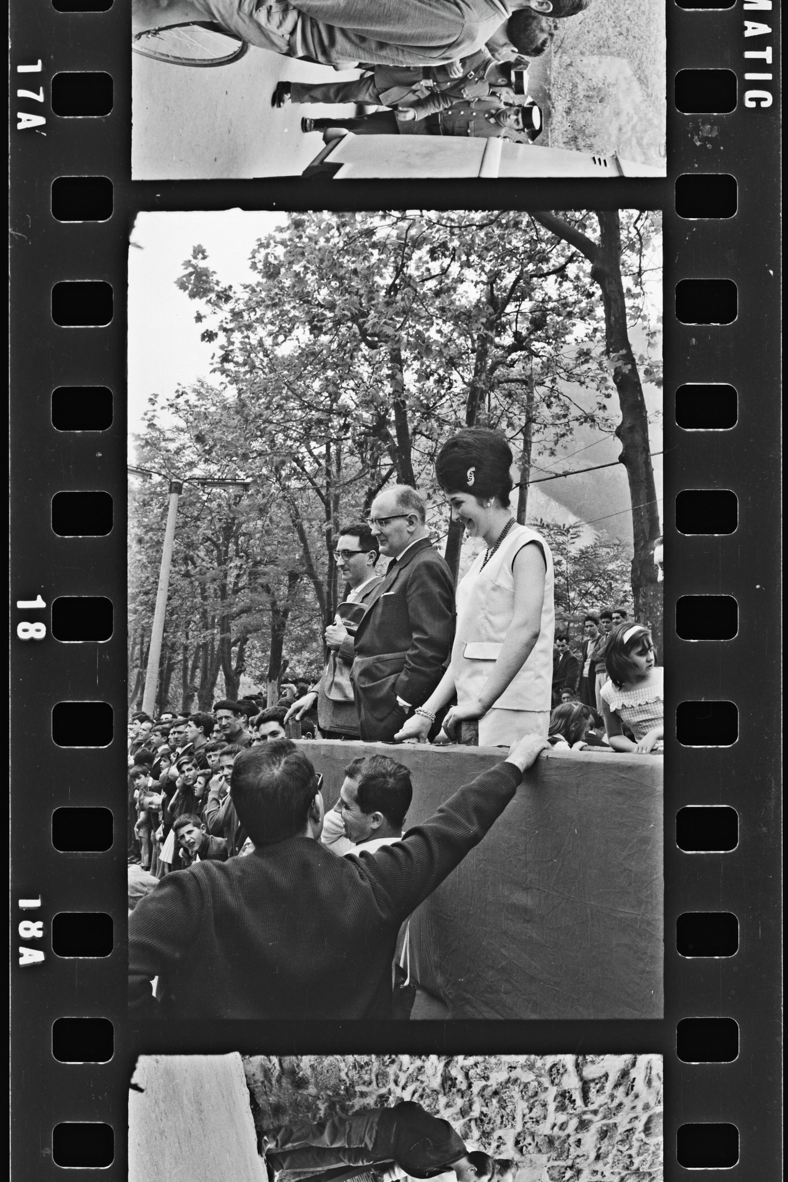 Txirrindulari lasterketaren tribunan alkatea eta neska sariak emateko zain