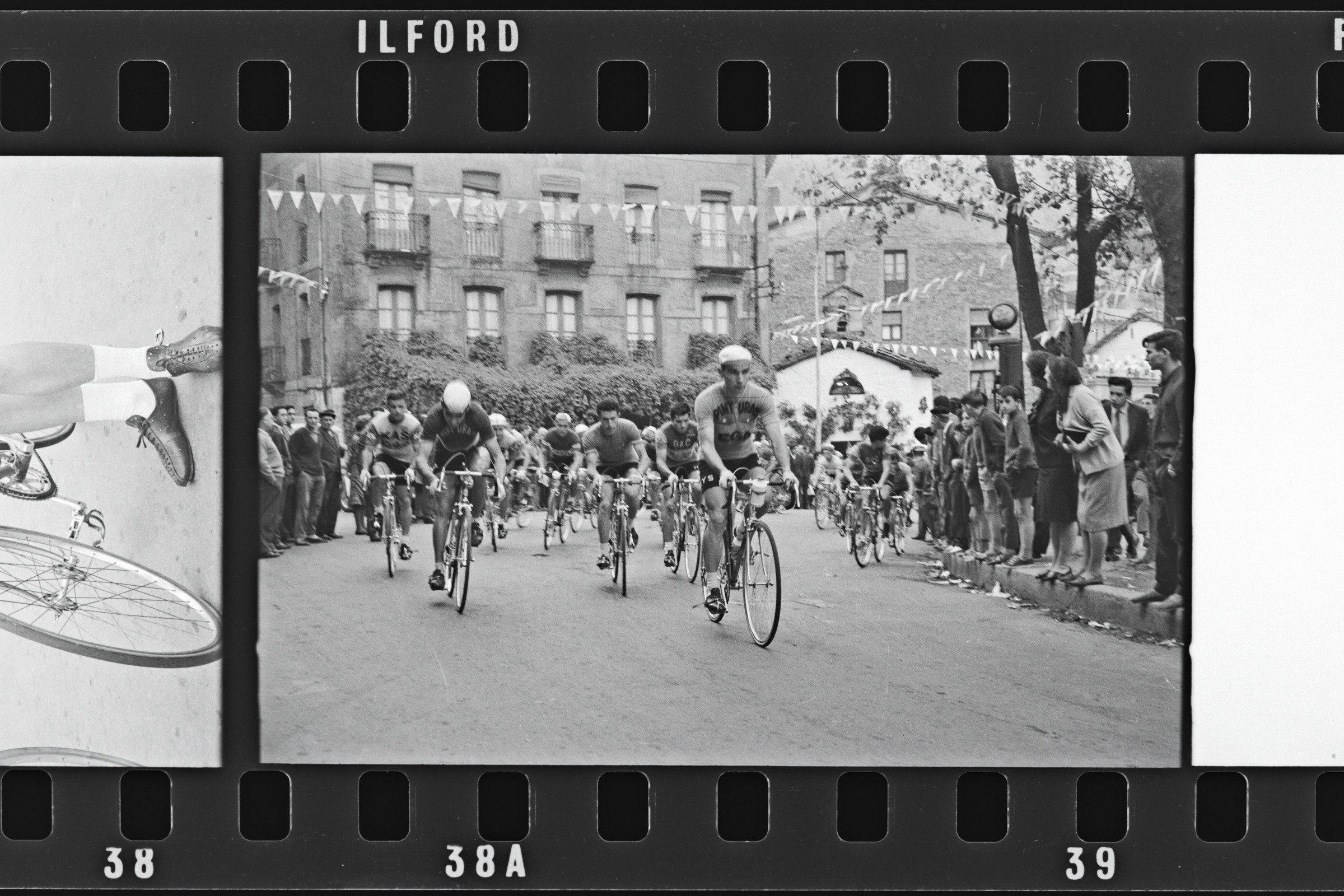 Txirrindulari lasterketaren irteera. Barrenean La Parra, San Antonioko ermita eta gasolindegiaren postea ikus daitezke