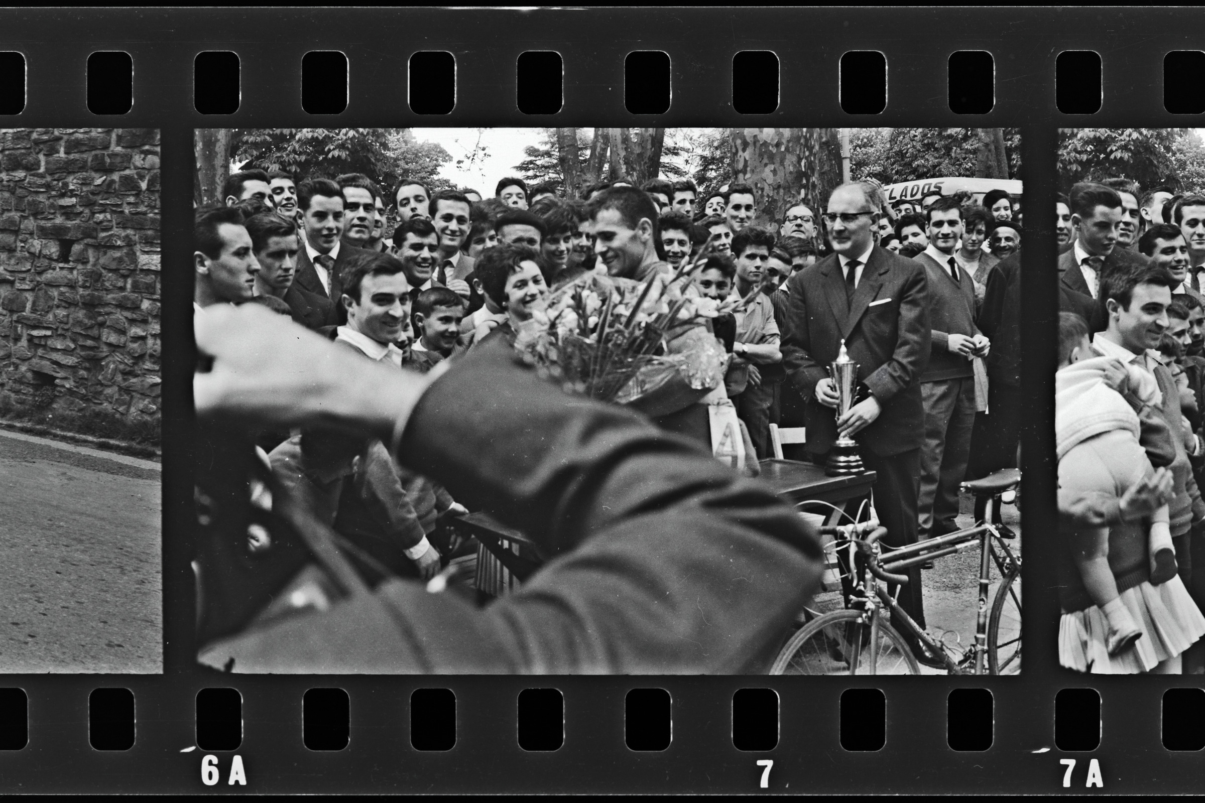 Txirrindularia lasterketaren sari ematea: irabazlea loresorta jasotzen
