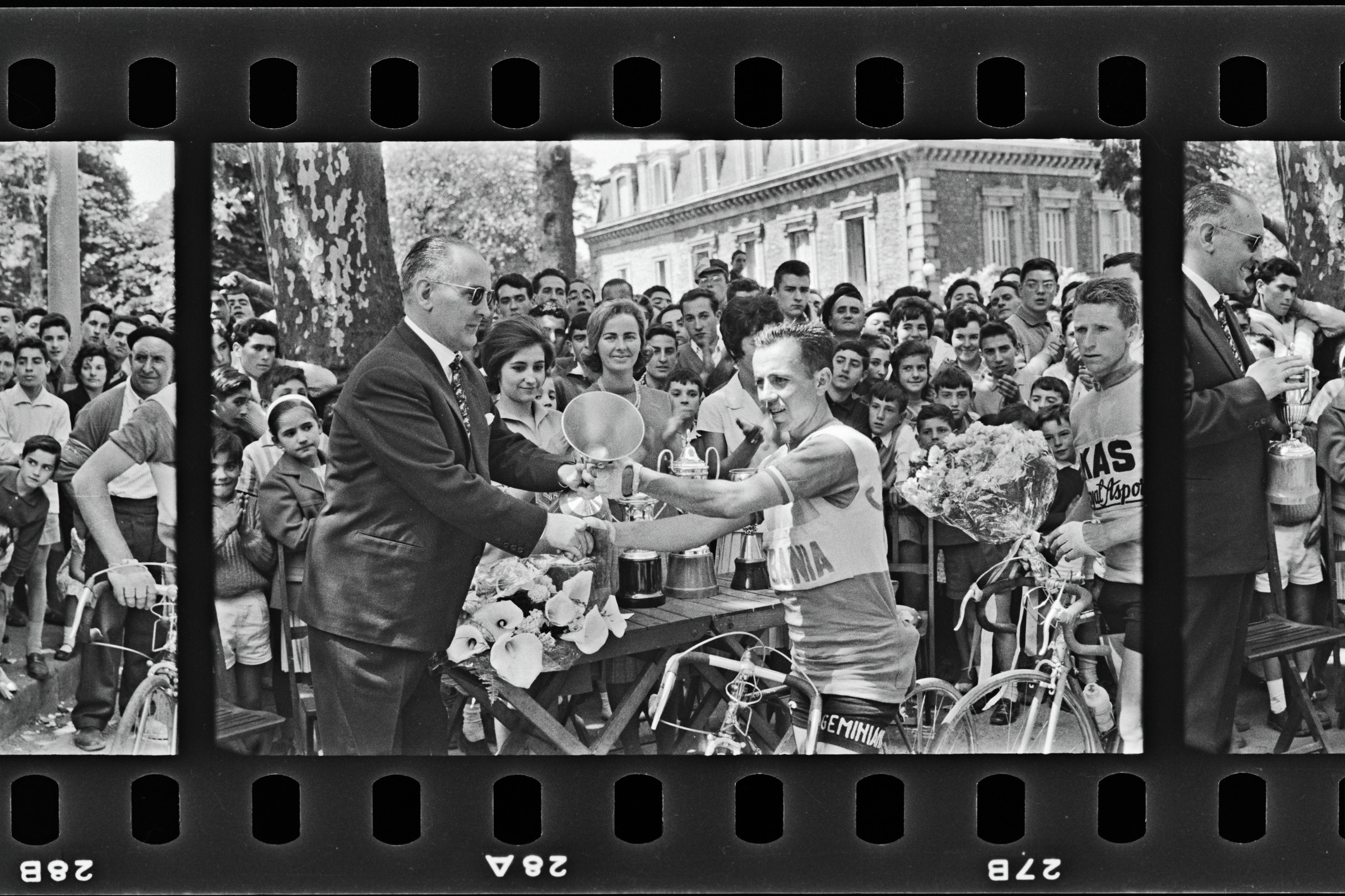 Txirrindularia alkatearen eskutik kopa jasotzen
