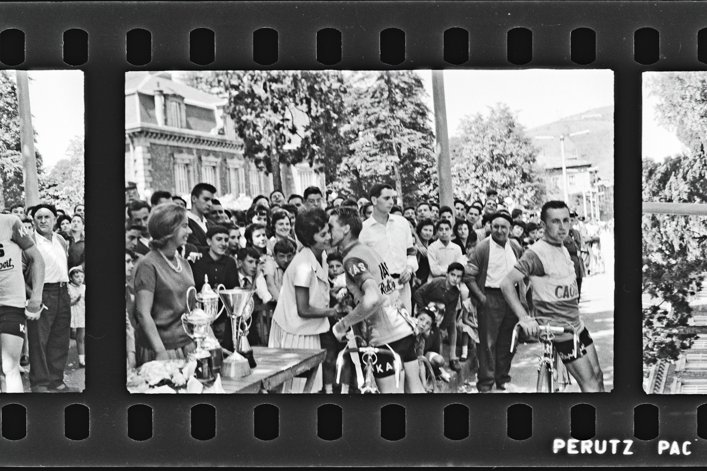Txirrindularia loresorta eta neskaren besarkada jasotzen, eskuman beste txirrindularia zain