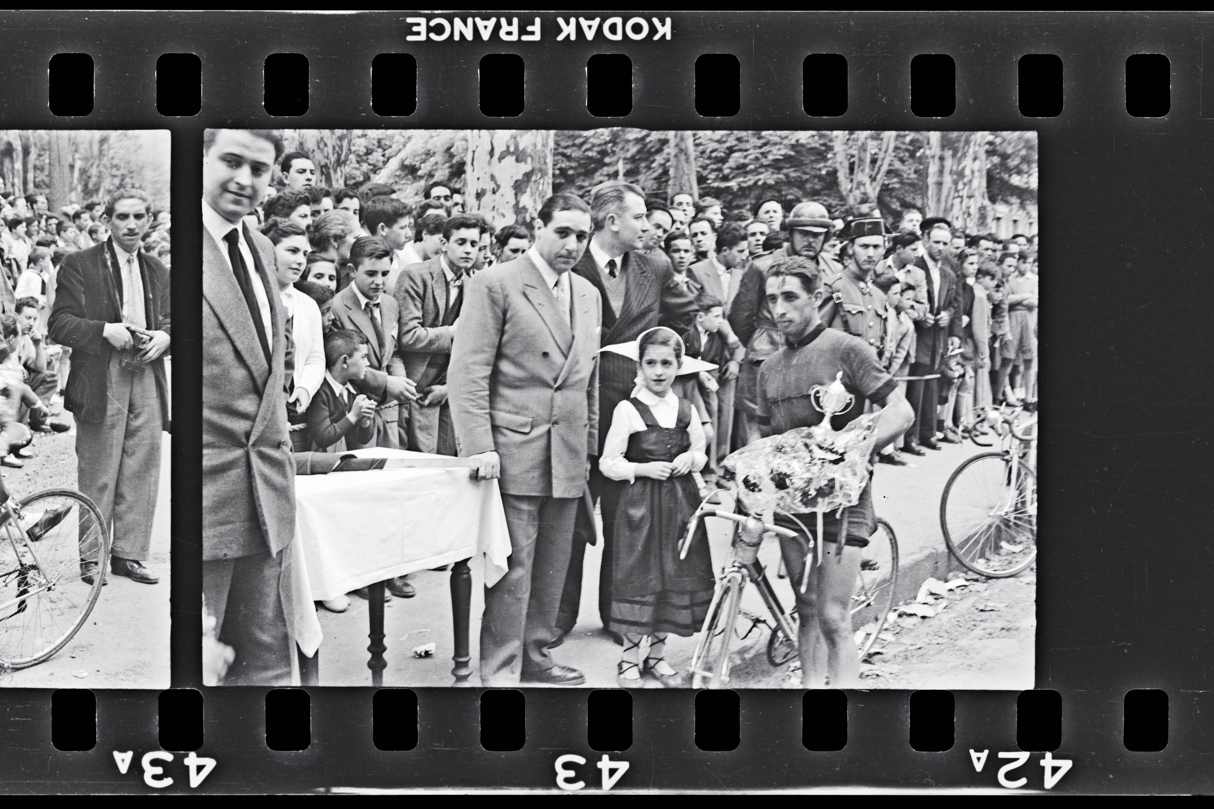 Txirrindularia loresortarekin bi gizon eta dantzariz jantzitako neskatilarekin; bigarren planoan goardia zibila eta motorista; barrenean ikuslegoa