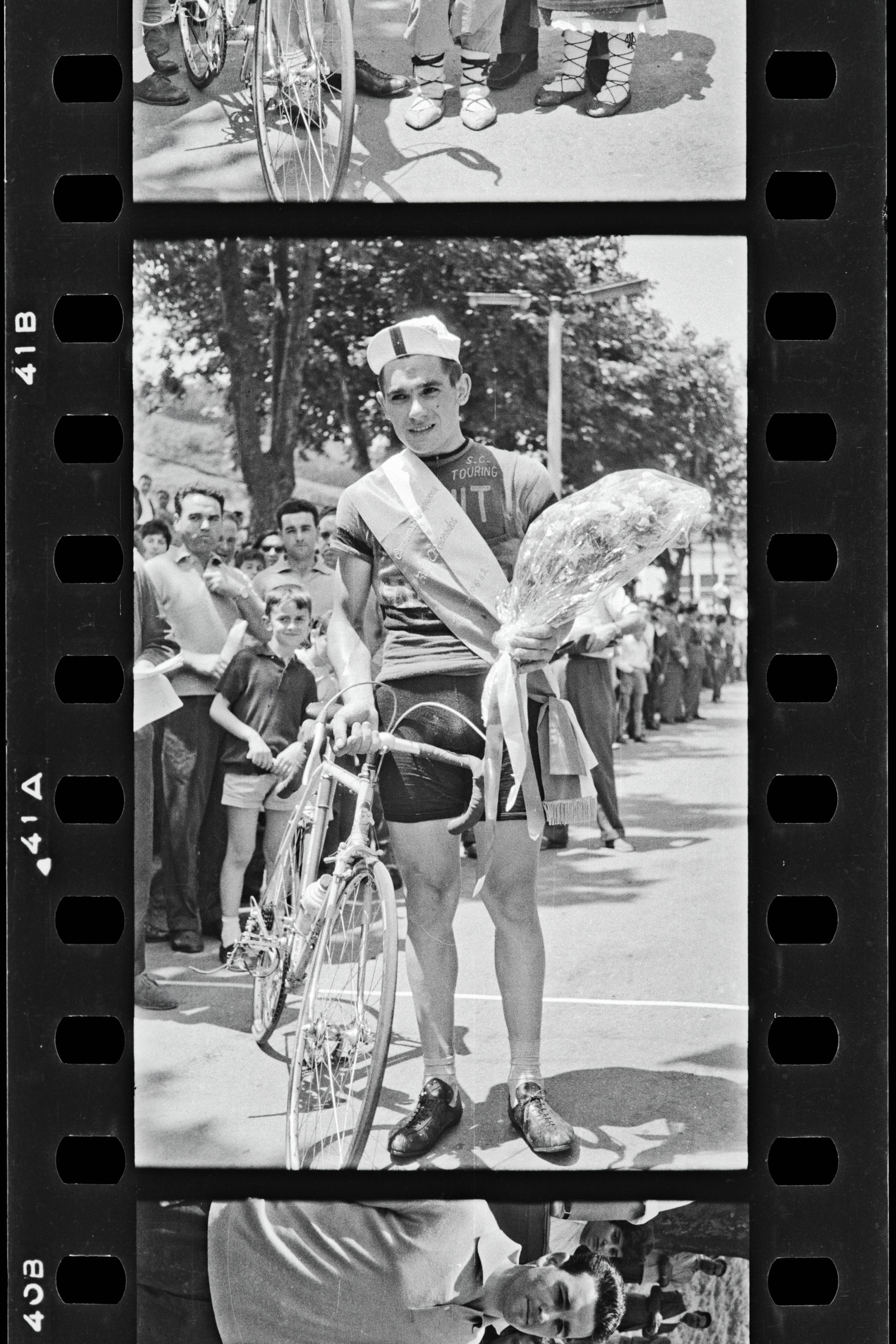 Txirrindularia irabazlearen banda eta loresortarekin