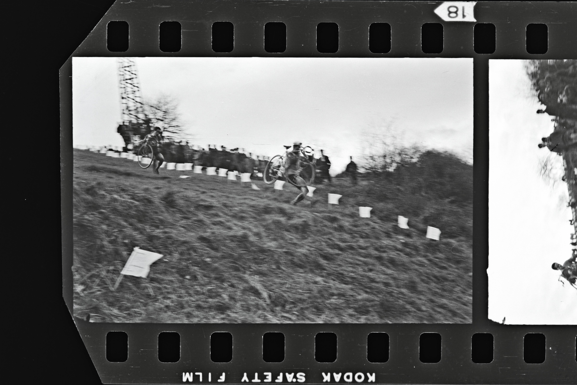Txirrindulariak ziklo-kros lasterketan; aurrean, lurrean bidea markatzeko banderolak, atzean ikuslegoa eta elektrizitate torrea