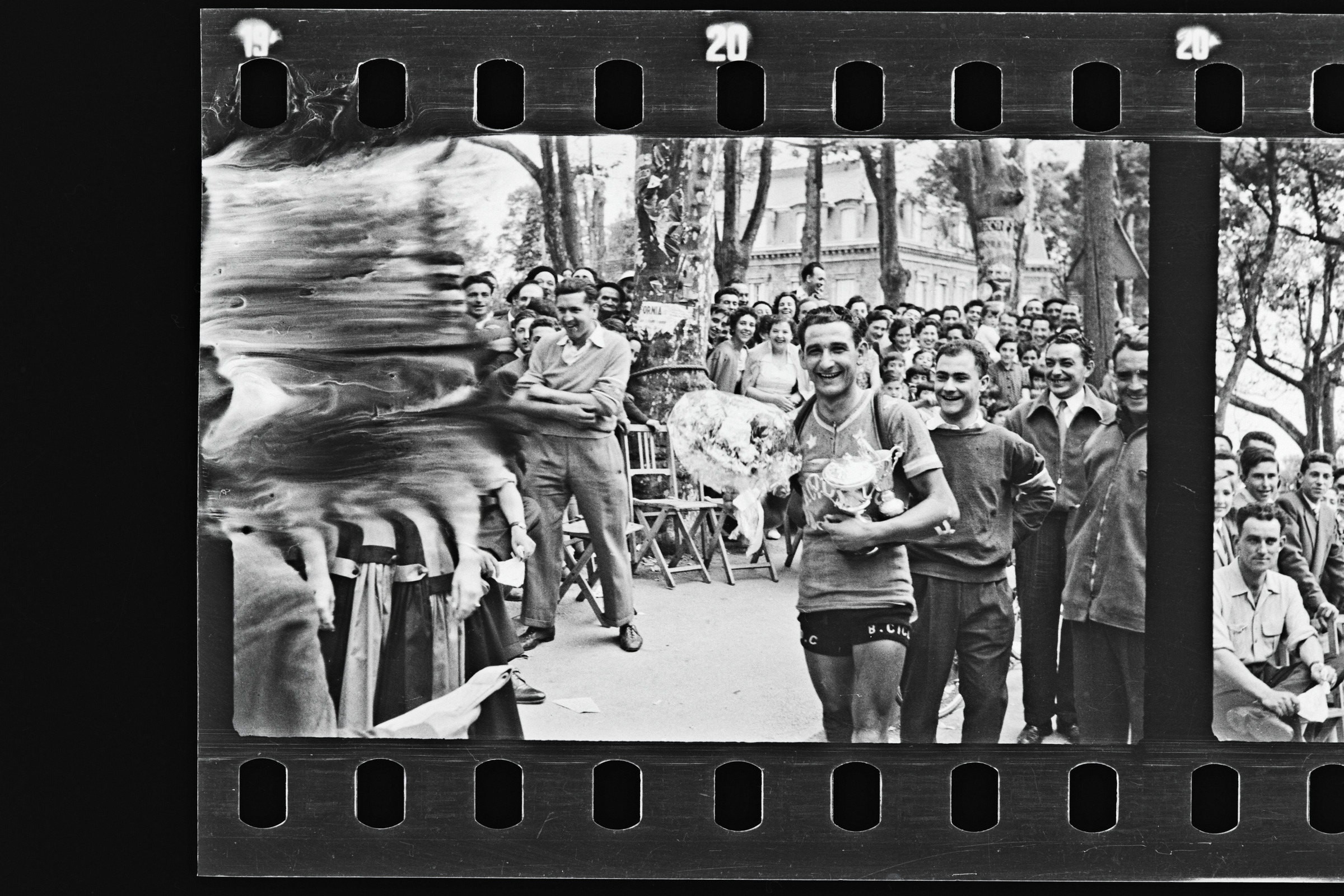 Txirrindularia loresorta eta koparekin helmugan.Eskuman hiru gizon, barrenean ikuslegoa