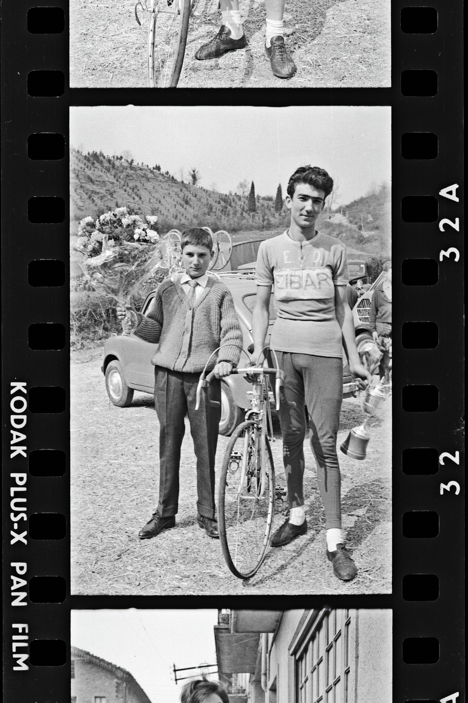Txirrindularia bizikletarekin eta ezkerrean mutikoa loresortarekin