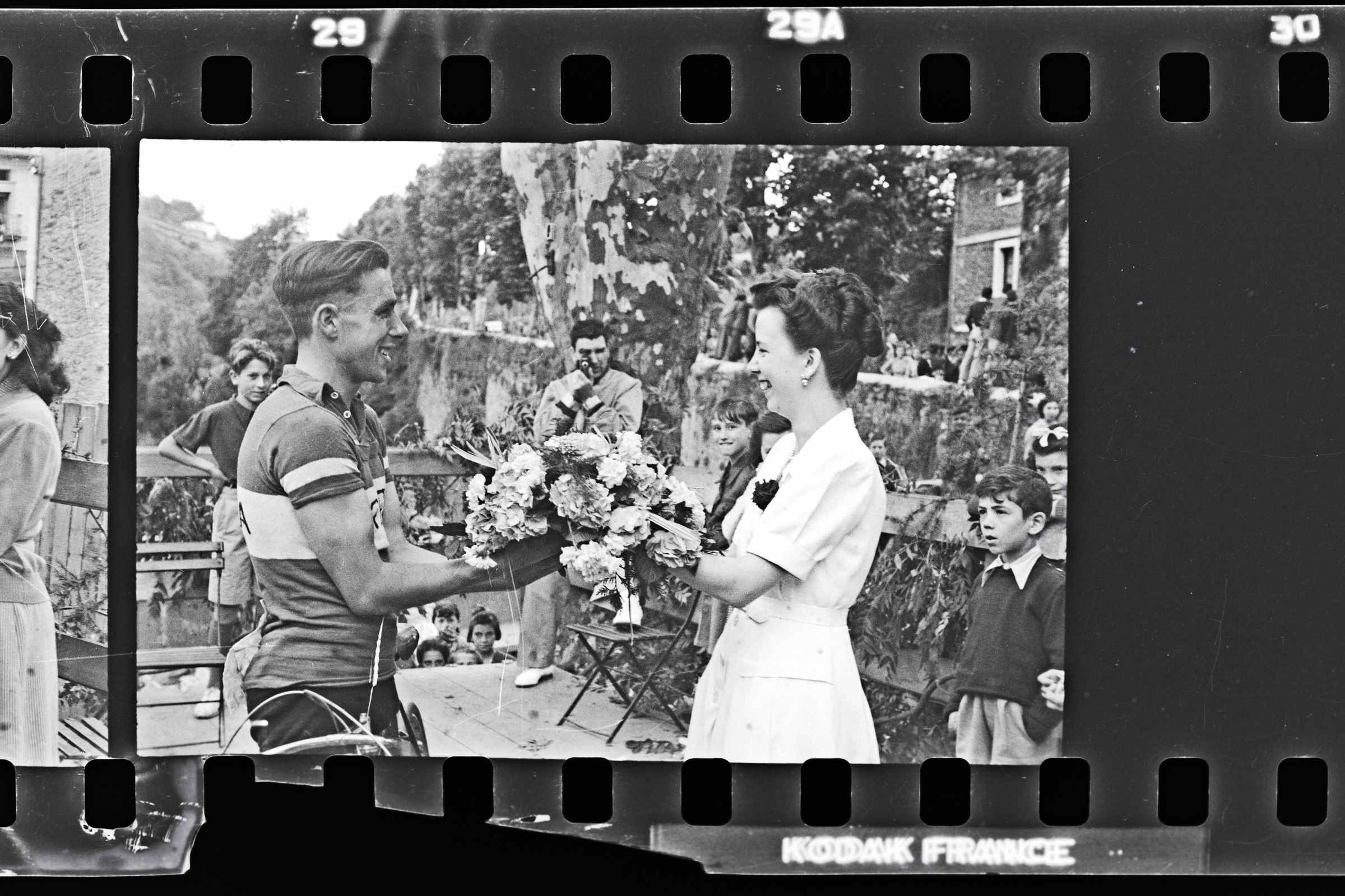 Orbea taldeko txirrindularia loresorta jasotzen; barrenean Espoloioko igoera ikus daiteke